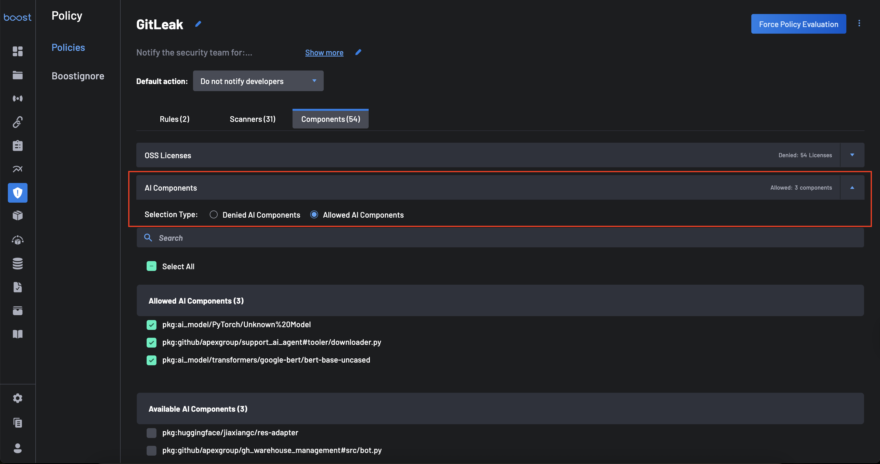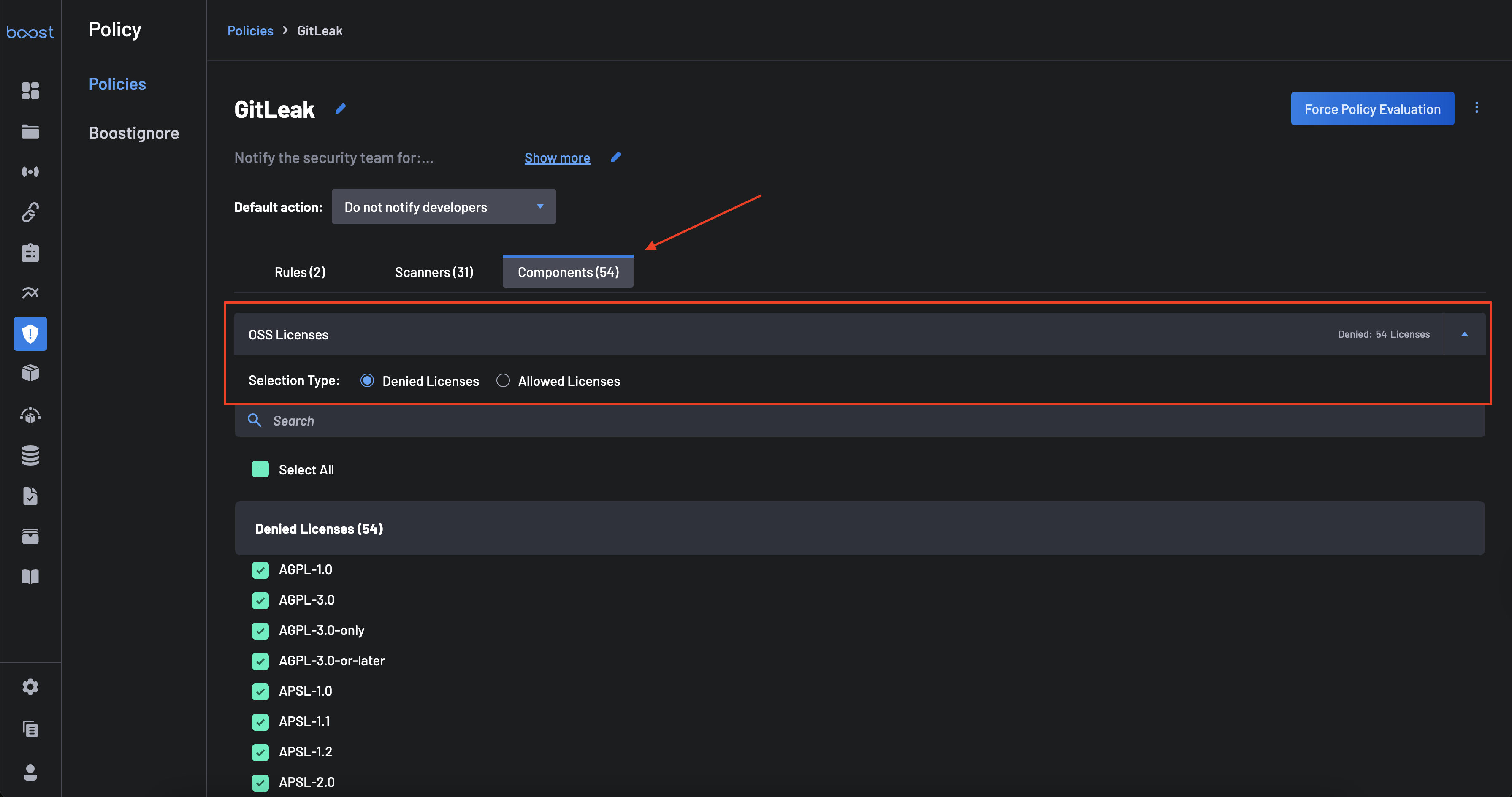 Cliquez sur le bouton Composants pour configurer des restrictions pour les Licences OSS et les Composants AI.
