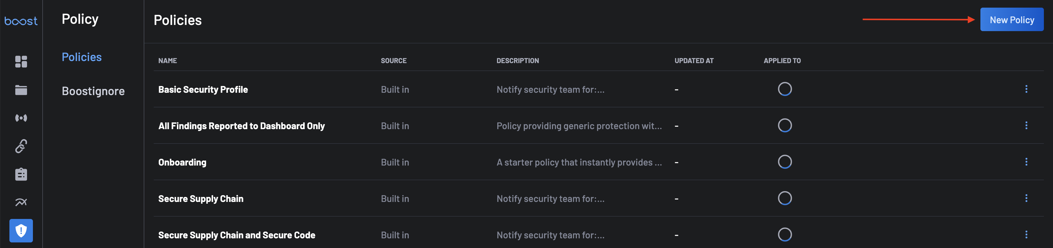 La page de Politique offre une vue centralisée de toutes les politiques de sécurité actuellement définies au sein de BoostSecurity. Cette page permet aux utilisateurs de gérer et de surveiller les politiques de sécurité appliquées à divers dépôts et organisations.