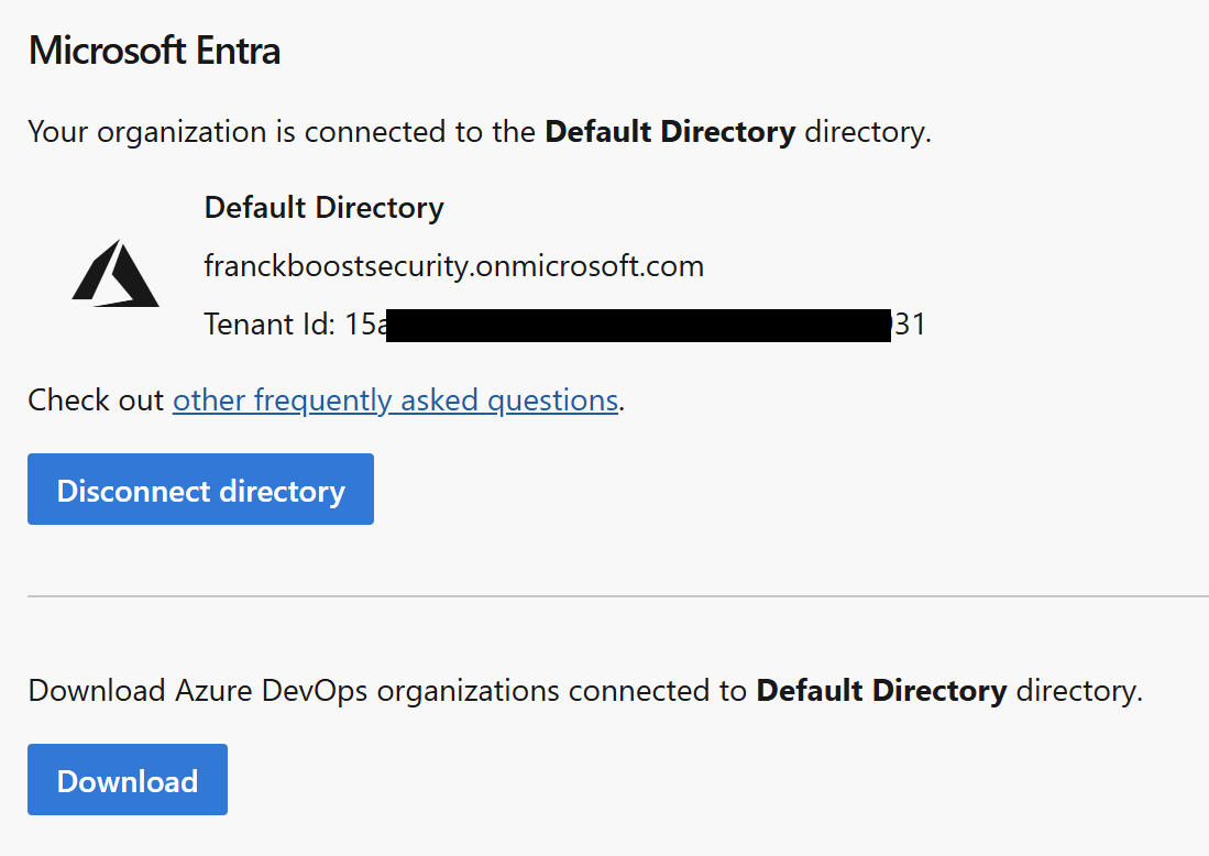 In your Azure DevOps organization settings, confirm that the organization is connected to your Entra ID tenant: