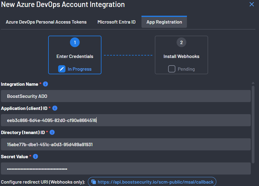- In the BoostSecurity console, navigate to Settings → Integrations → ADO Account Integration , and select the App Registration tab.