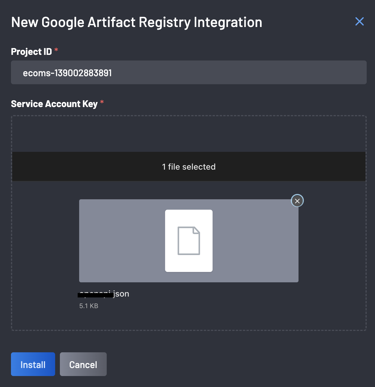 Input the Project ID and the Service Account JSON file, and then click the Install button to finalize the integration.
