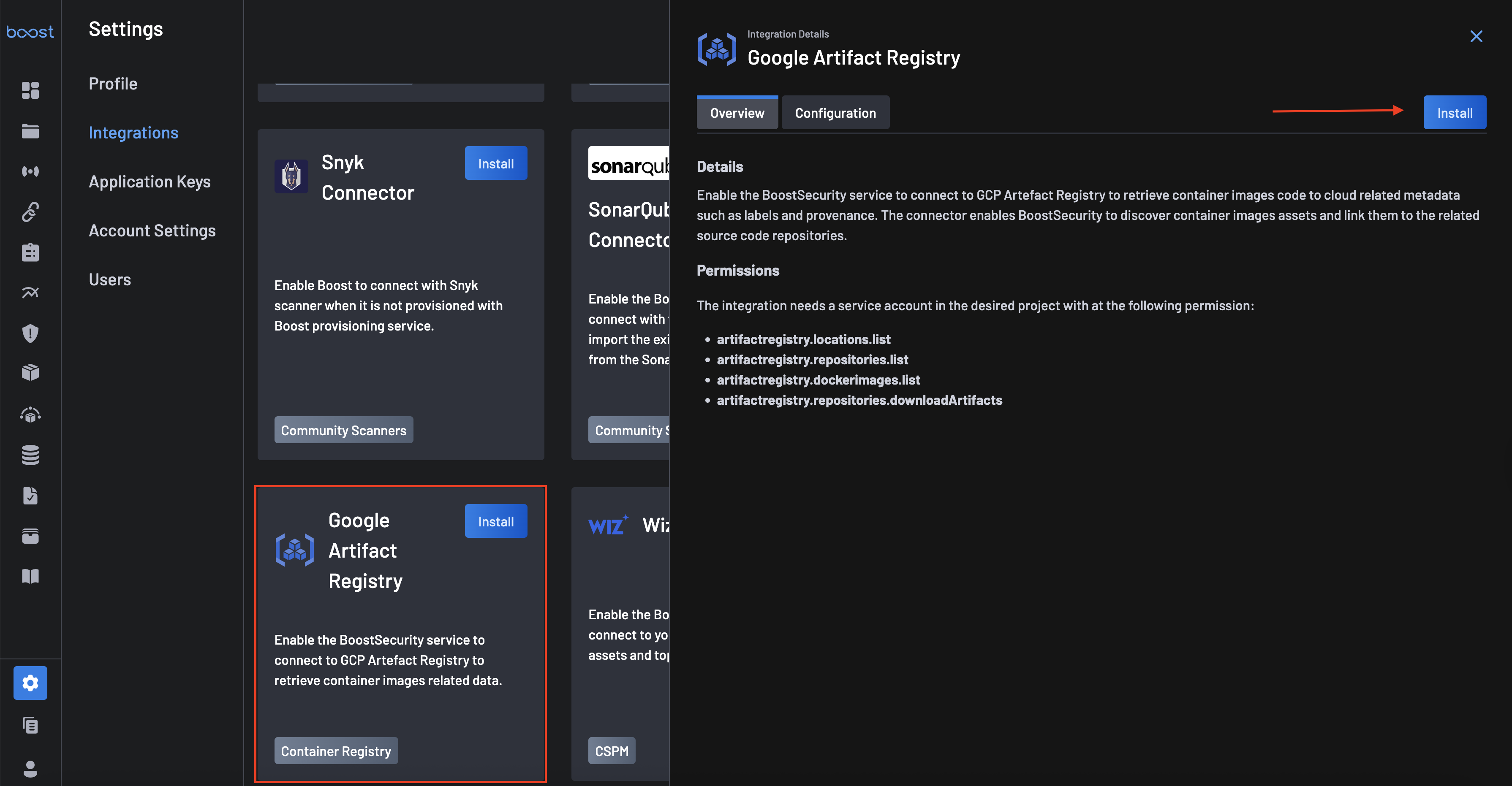 This document outlines the process to configure the BoostSecurity platform to integrate with Google Cloud Platform (GCP) Artifact Registry. This integration enables BoostSecurity to retrieve container image metadata, including labels and provenance, and associate these assets with their corresponding source code repositories.